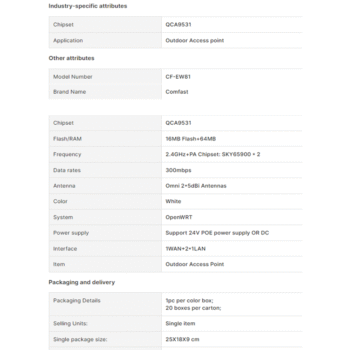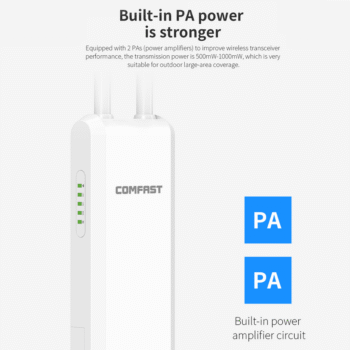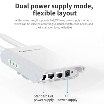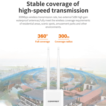 The Comfast EW81 High-Power Outdoor Access Point provides reliable WiFi coverage up to 300 Mbps over 2.4 GHz, perfect for homes, offices, and outdoor networks. With dual 5 dBi antennas, PoE support, and weatherproof protection, it ensures long-range, stable connections in challenging environments. Supports multiple working modes for flexible deployment.